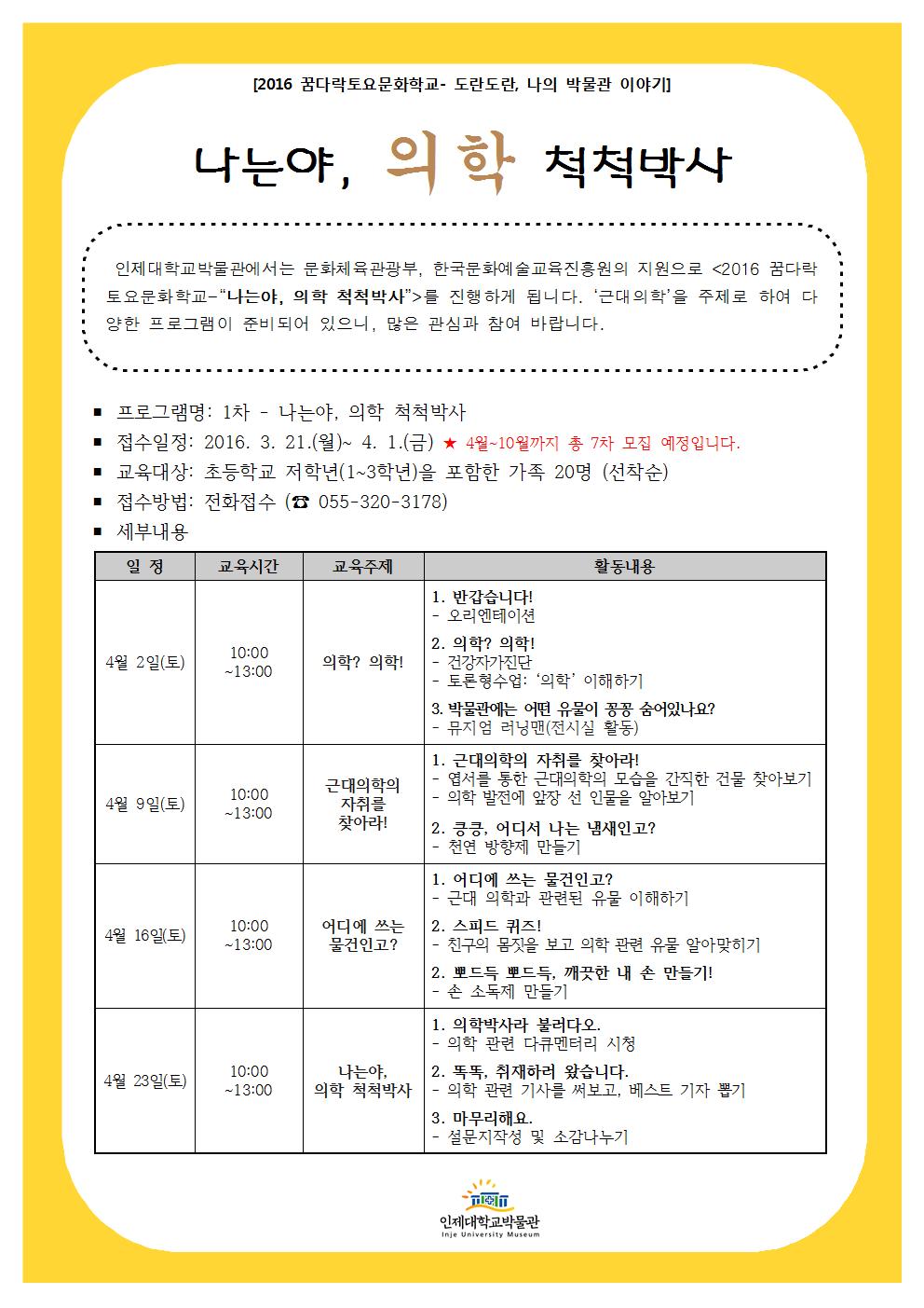 [인제대박물관] 2016 꿈다락토요문화학교 개최 및 1차 모집 안…